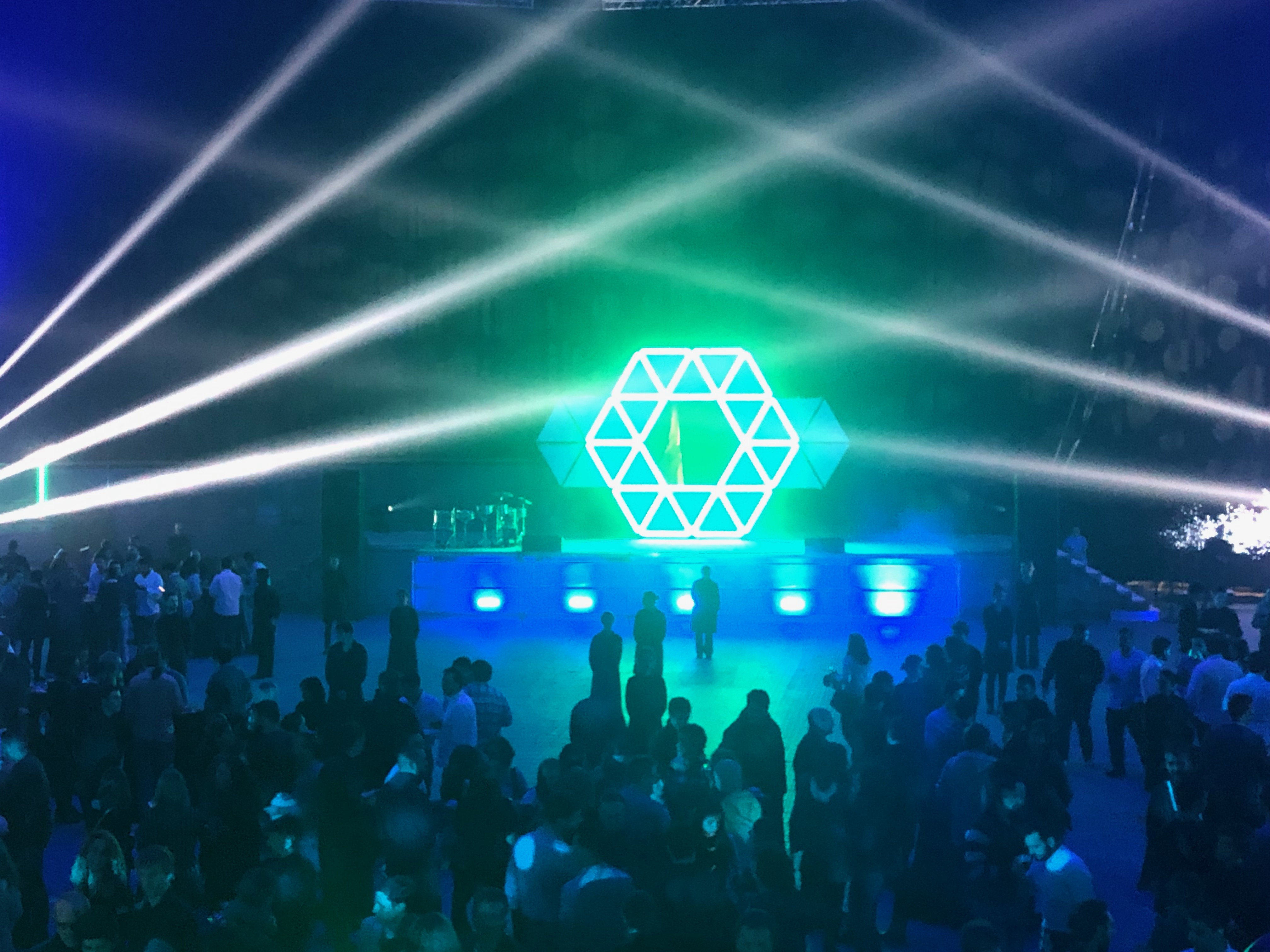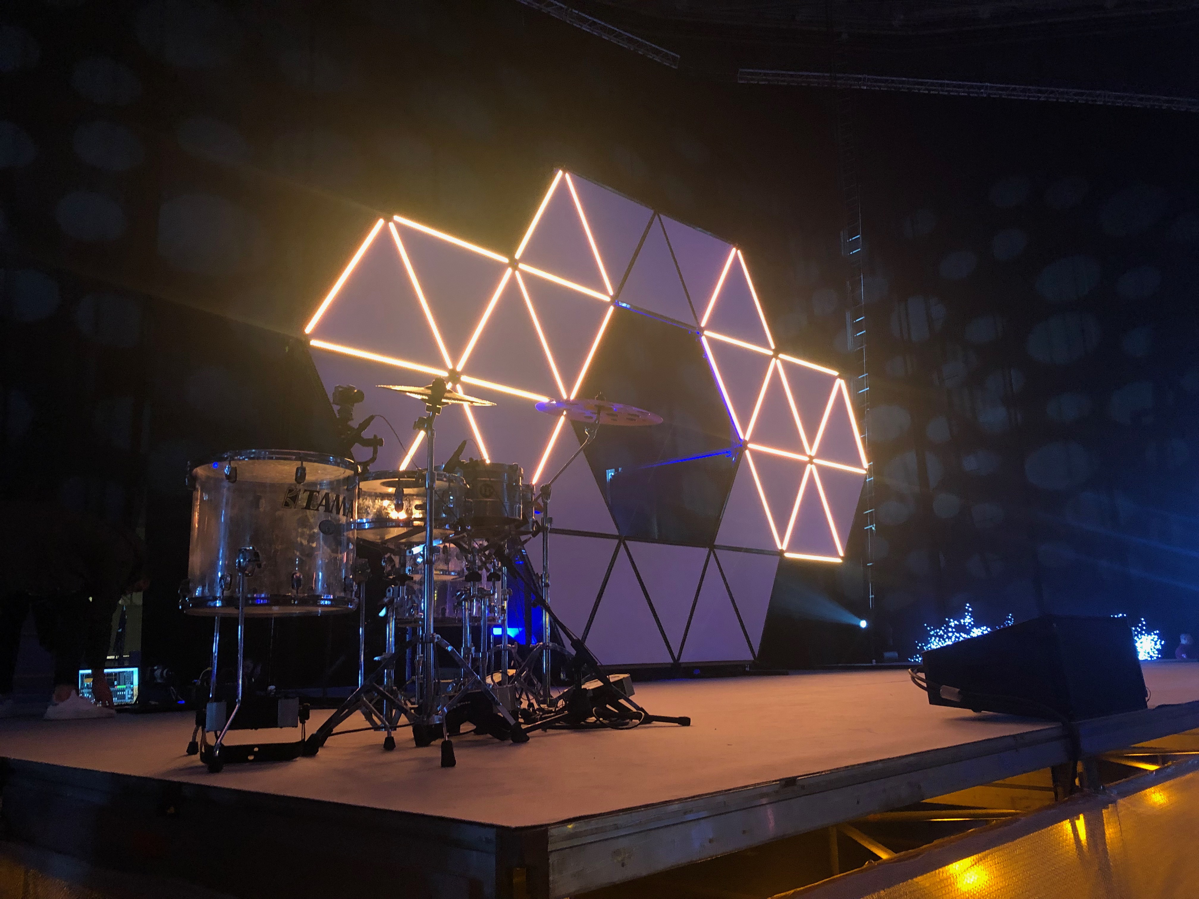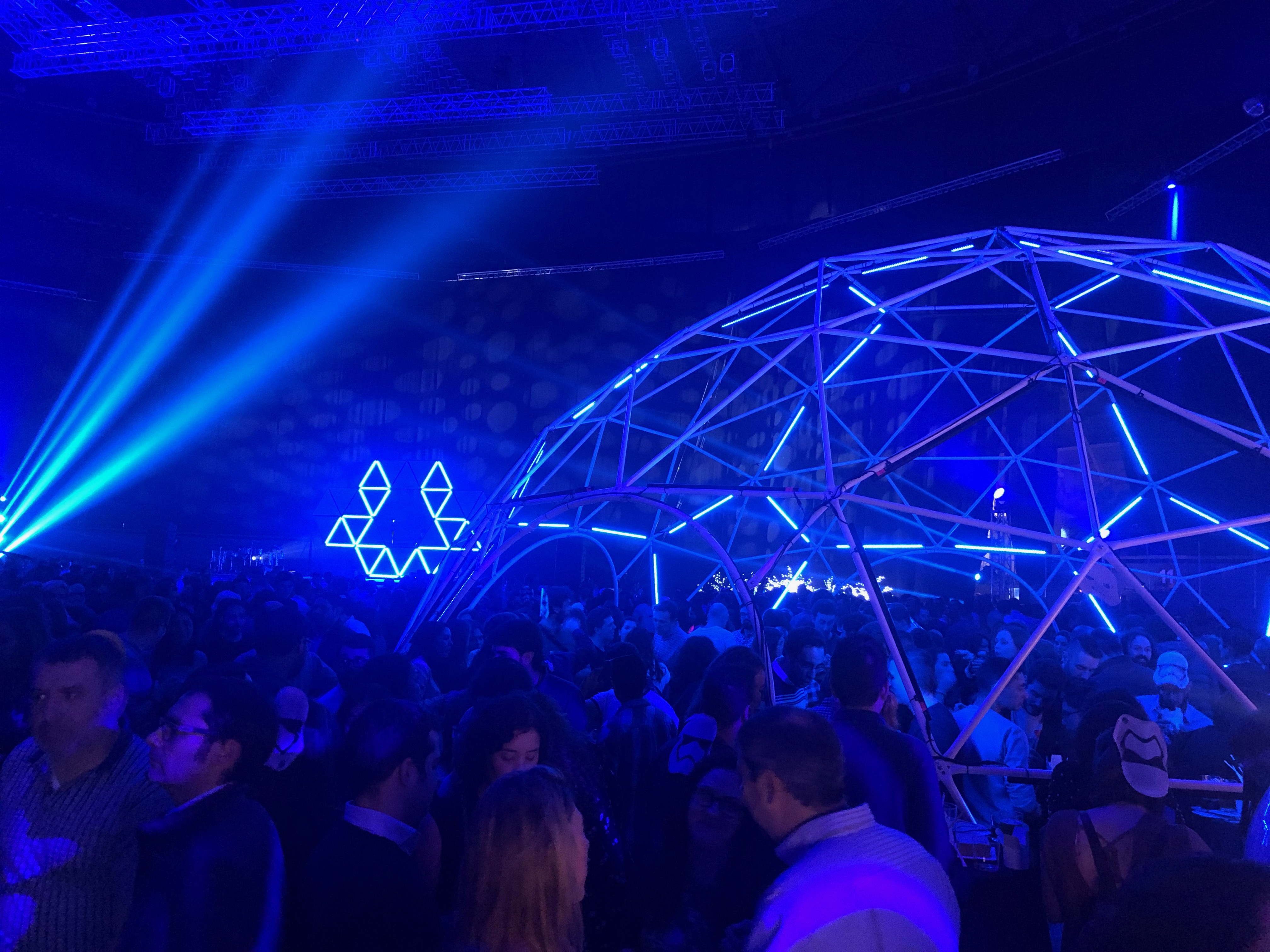 Os mostramos a continuación el resultado de unir un domo geodésico con luces de led controladas. Además el diseño del escenario principal basándonos en triángulos.