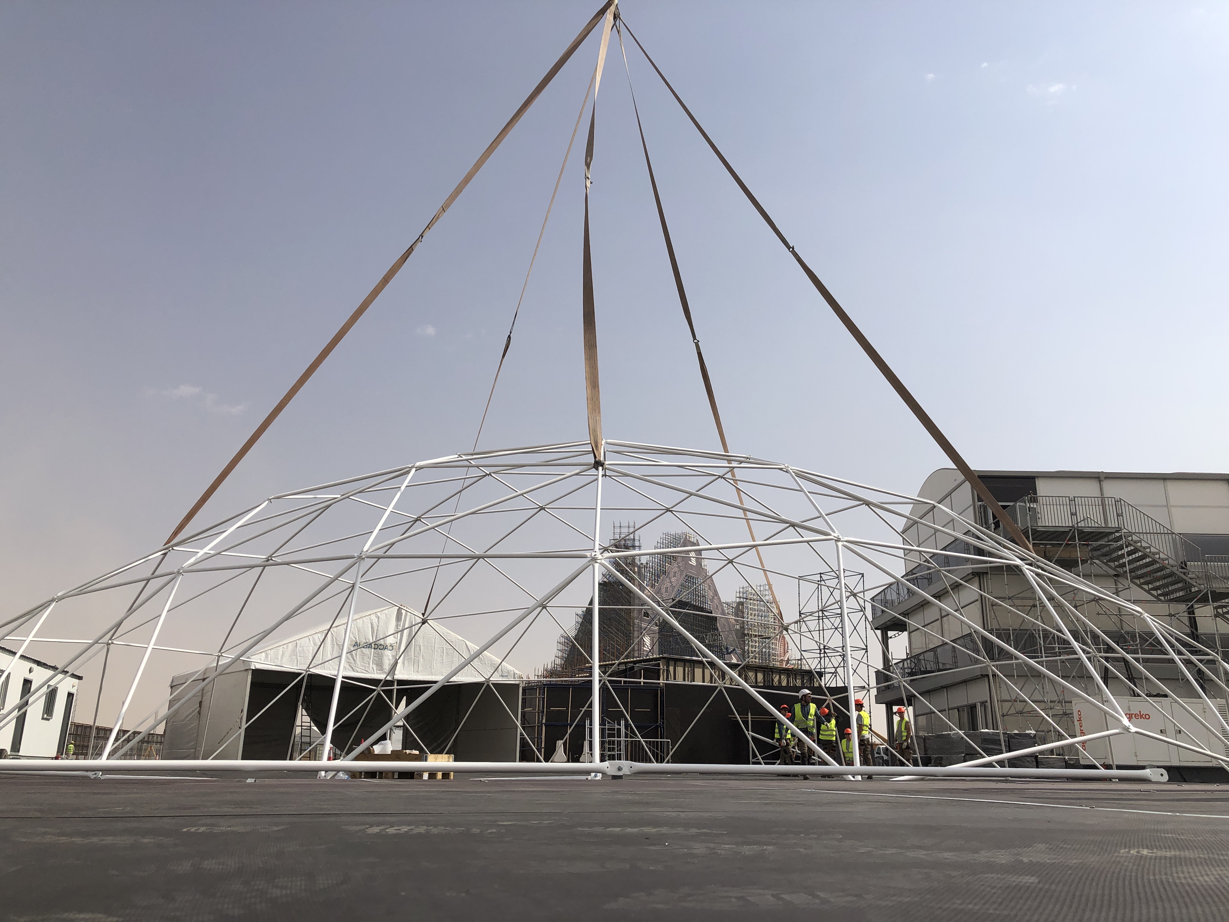 Un montaje que se prolongó durante 4 días pero mereció la pena. El resultado fue un enorme domo que albergará diferentes actividades durante el festival.