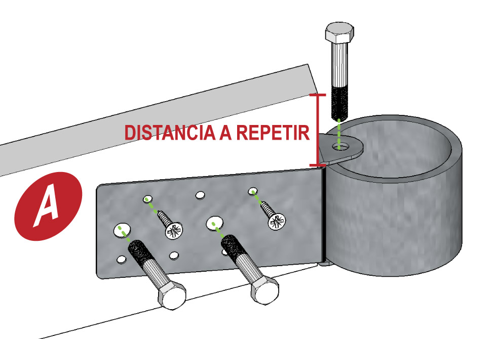 Otra ventaja del sistema Kleshya es que puedes montar las piezas según se va montando la estructura. Se fija el enganche con dos tornillos de madera para que no se mueva al taladrar y hacer los orificios donde irán nuestros tornillos M12. Puede montarse con tornillos solamente ya que dispone de 6 agujeros para ello.