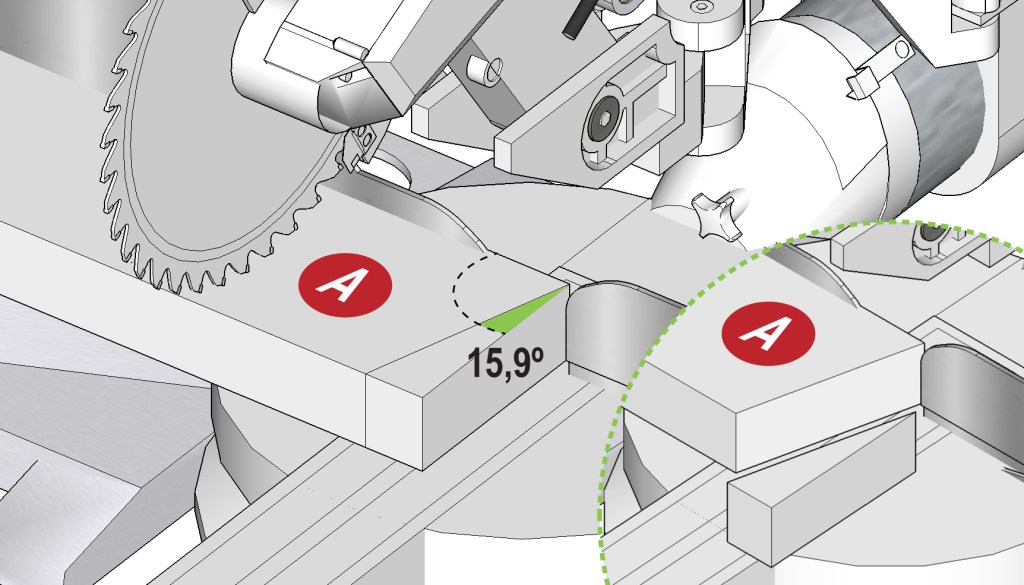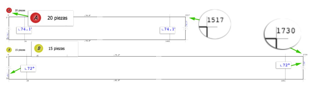 - 20 x A de 151,7 cm en cuyos extremos tenemos un mismo ángulo de 74,1º o en nuestra ingletadora calculamos: 90º – 74,1= 15,9º