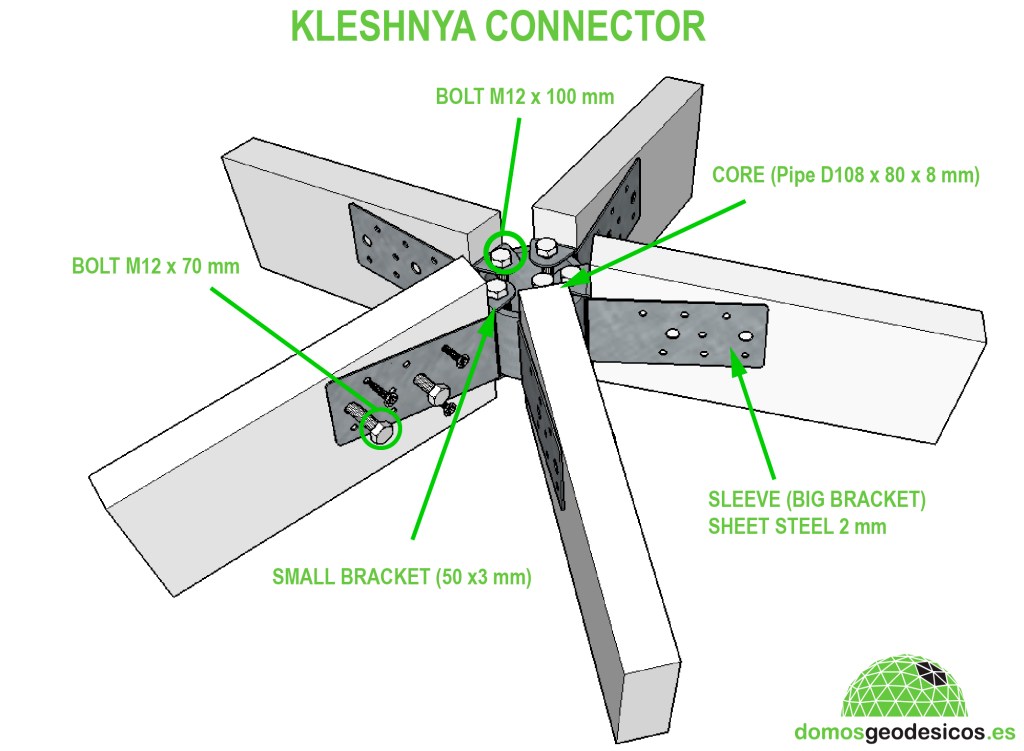 El sistema KLESHNYA fue inventado por Roman Anatolievich Prodajko de Ucrania y nos permite usar un sólo tipo de conector para todos los domos con diferentes frecuencias aunque está enfocado principalmente para grandes domos y que soporten mucha carga. Es extremadamente fuerte para maderas cuyo grosor sean de 5 cm y un ancho entre 12 y 20 cm